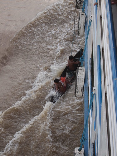En aquest últim trajecte ens adonem de les dificultats de les comunitat aïllades al llarg del riu. Es veuen obligats a demanar desde les seves modestes canoes als passatgers dels grans vaixells. Alguns amb una mica més de recursos intenten vendre camarons o palmitos enganxant-se, amb el perill que suposa, als grans vaixells.